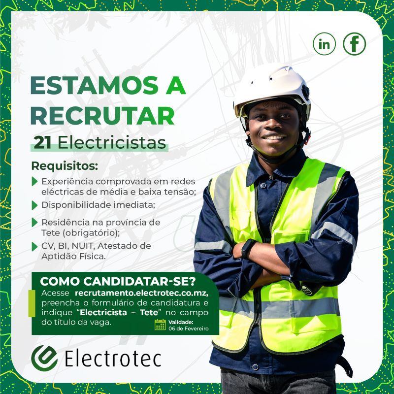 Os candidatos interessados que reúnam os requisitos deverão submeter a sua candidatura até ao dia 06 de Fevereiro de 2026, através do site https://lnkd.in/ea6edKY4 indicando no assunto “Vaga Electricista – Tete”